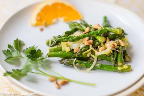 Sauteed asparagus and leeks with orange zest and toasted pine nuts
