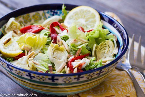 Rustic tricolor salad of butter leaf, roasted red peppers and artichoke hearts