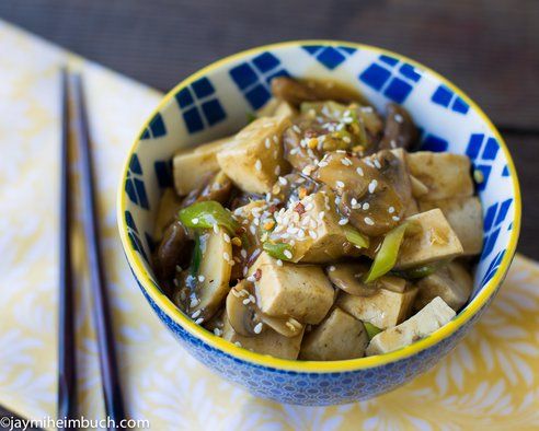 Spicy sauteed tofu with wild mushrooms and a ginger-garlic sauce