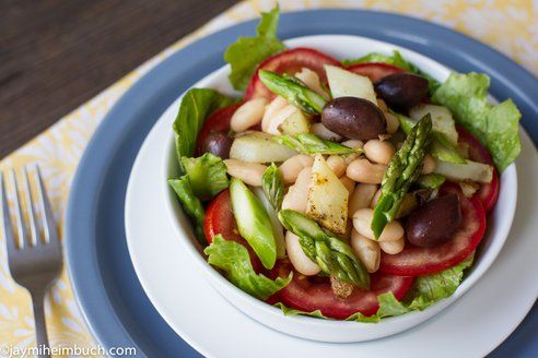 Bean salad with roasted potatoes, asparagus and pesto