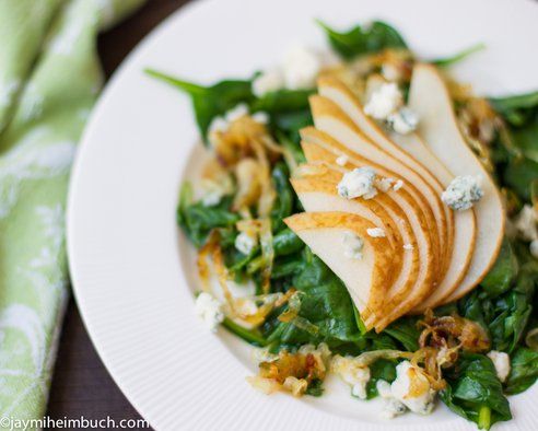Pear and spinach salad with caramelized onions and blue cheese
