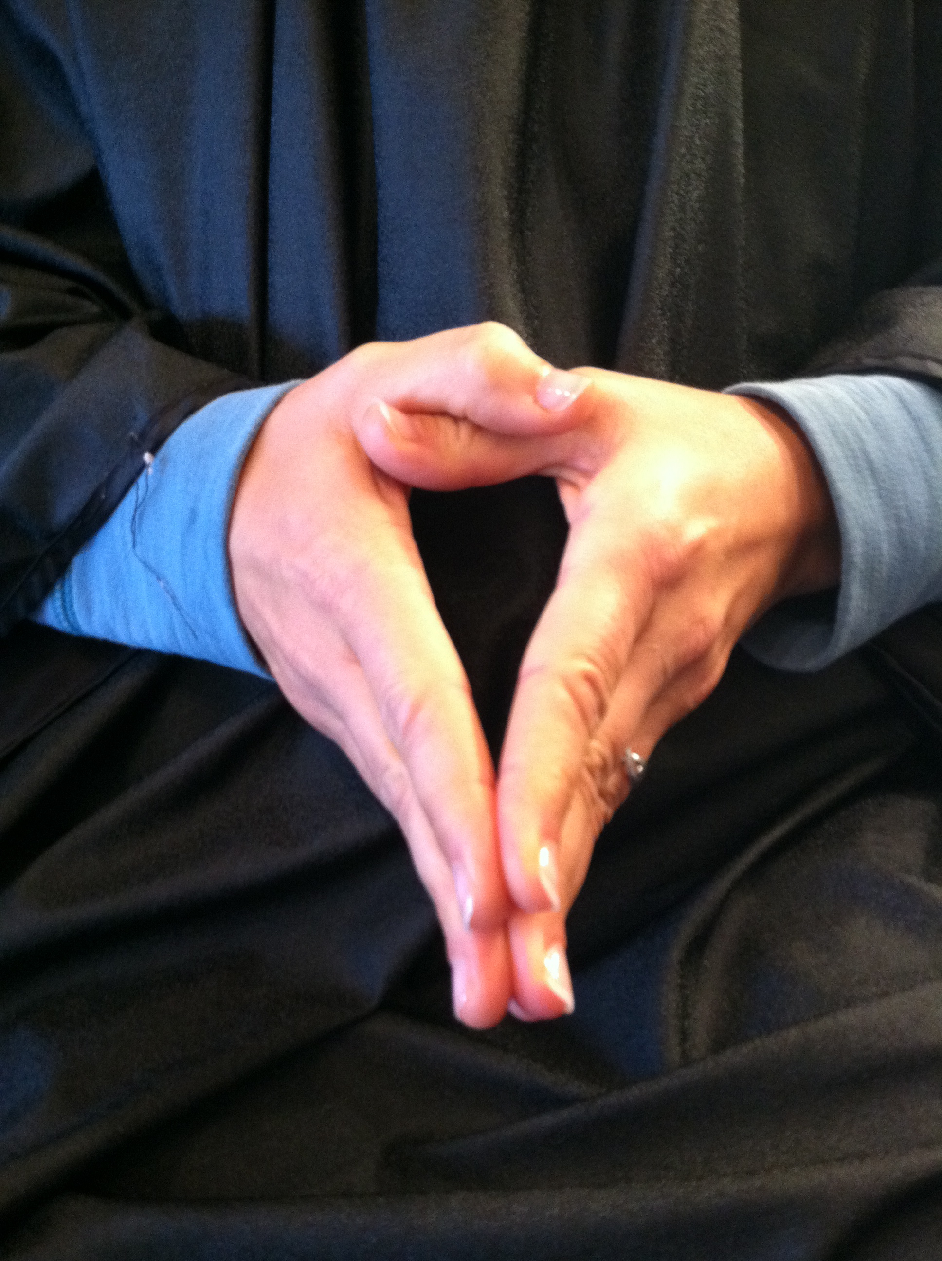 Sit on your knees and cross your fingers on the inside of your hands, without the thumbs. Let the thumbs touch at the tops, and pull them up a bit, as shown in the picture above.