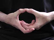 - Sit cross-legged and put your hands in front of the lower part of the breast. The middle fingers should be straight and touch the tops, pointing away from you. The other fingers are bent and touch at the two upper phalanges. The thumbs point towards you and meet at the tops, as shown in the picture above.