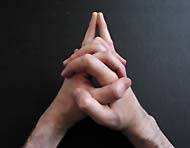 - Sit cross-legged and lay your hand before your stomach. Let the little fingers point up and away from you, touching at their tops, and cross the rest of the fingers with the left thumb underneath the right, as shown in the picture above.