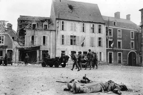 A slain German soldier lies in the main square of Place Du Marche in Trevieres.