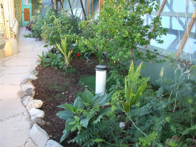 This phenomenon results from the solar heat being absorbed and stored by ‘thermal mass’ — or tires filled with dirt, which make up the structure of the Earthship. The thermal mass acts as a heat sink, releasing or absorbing heat it when the interior cools and heats up, respectively.