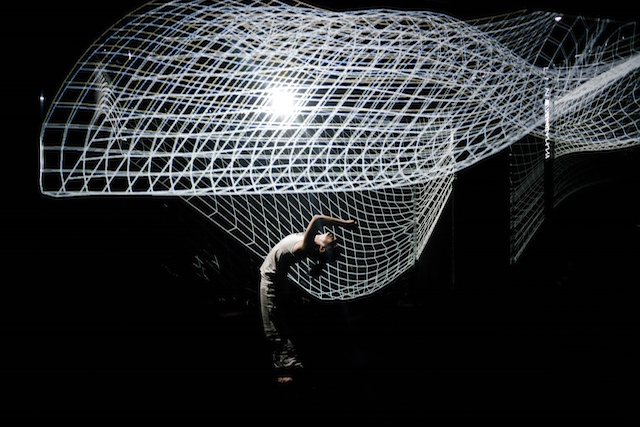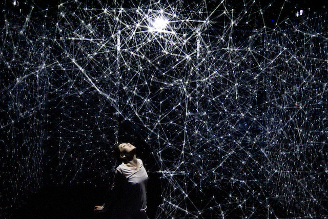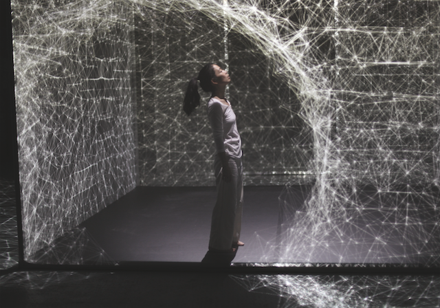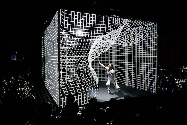 Inside a cube fashioned from translucent veils, a dancer takes a visual journey into a 3D space between dreams and reality. Hakanaï is a digital solo performance from Adrien M / Claire B that made its debut at BAM’s Fishman Theatre on March 17, 2015. The choreographed performance installation combines video projection mapping, CGI, and sensors to dynamically respond to the movements and proximity of its performer. Its visuals and sounds are generated and animated live, offering a uniquely different performance for each and every iteration.